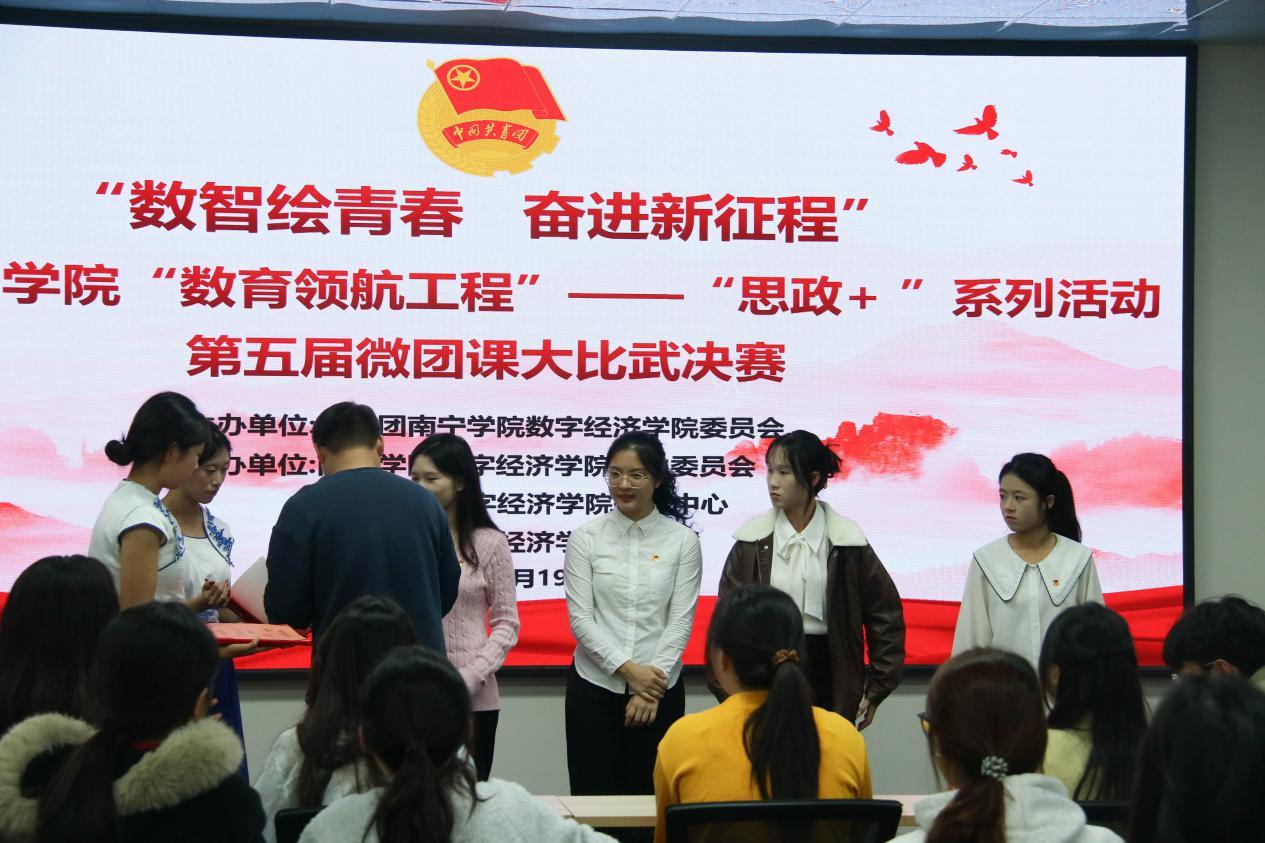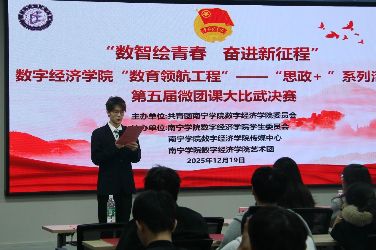 为引导广大团员青年厚植家国情怀、涵养进取品格,将个人成长与国家数字强国战略紧密结合,创新思政教育形式,激发青年学子在数字化时代的奋进动力,12月19日晚,共青团南宁学院数字经济学院委员会“数智绘青春,奋进新征程”微团课大比武决赛在活动中心202顺利举行。