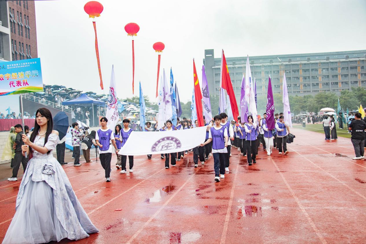 开幕式上,数字经济学院方阵踏着整齐的步伐惊艳亮相。学子们身着统一服装,手举特色旗帜与横幅稳步前行,他们以整齐的队列彰显协作之力,以昂扬的姿态传递奋进之志,用青春风采为运动会开幕式注入了独特的数院活力。