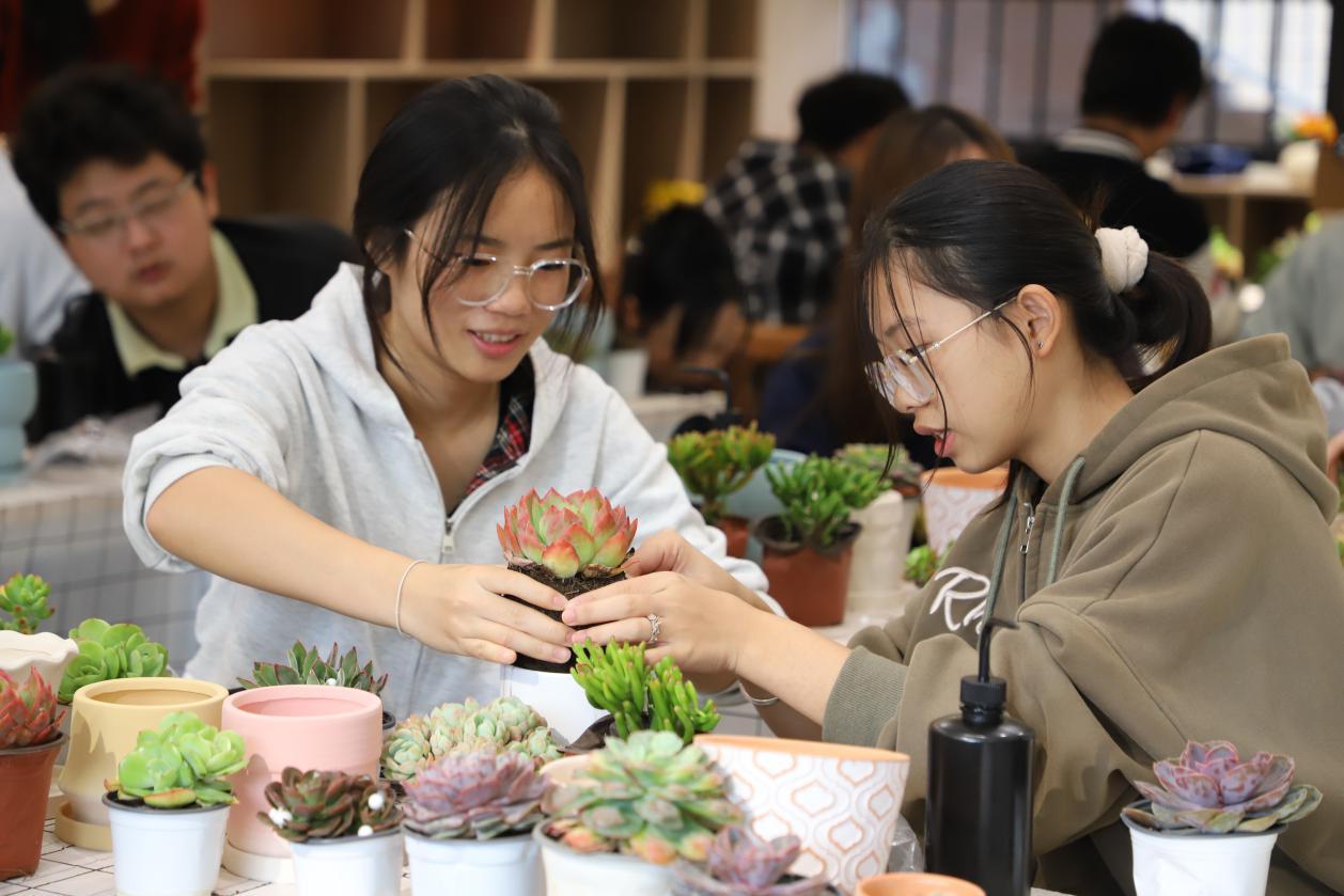 动手种植环节成为活动的高潮。同学们小心翼翼地将多肉从育苗盆中取出,轻抖根部土壤,再根据植株大小在新花盆中铺垫陶粒、填充土壤,随后精准定位将多肉定植,最后用铺面石装饰盆面。过程中,田爽副处长、韦丹老师穿梭在各位同学之间,耐心解答同学们的疑问。在老师们的专业指导下,原本略显生疏的操作变得流畅起来,每个人都全情投入,感受着亲手创造美的过程。