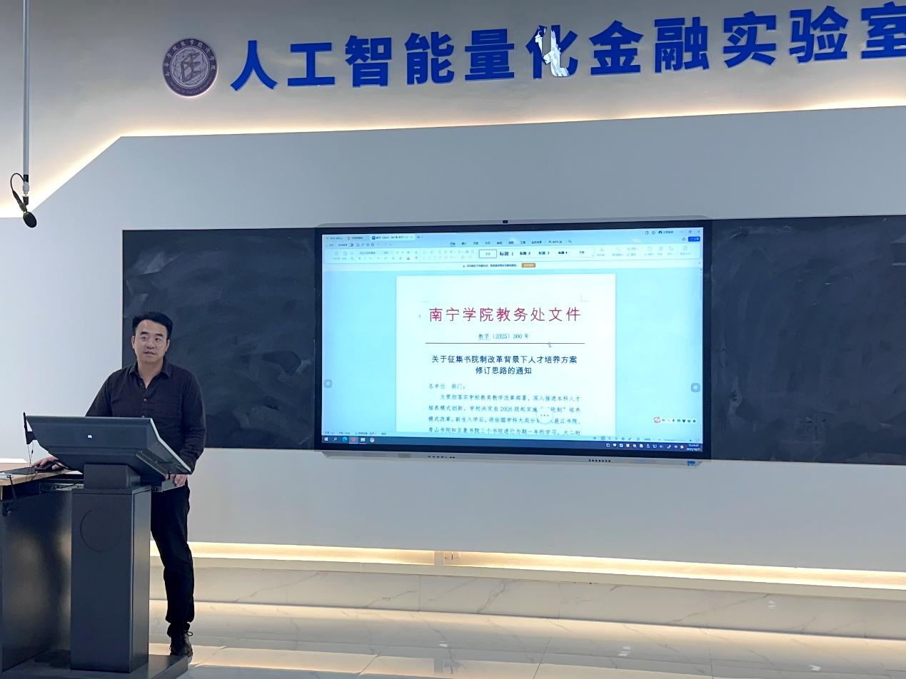 会议由大数据管理与应用教研室主任刘昊主持。他首先介绍了学校书院制改革的总体背景、核心理念与对专业人才培养提出的新要求。他强调,本次修订工作需紧扣立德树人根本任务,将书院通识教育与专业学院特色培养深度融合,旨在培养兼具扎实专业知识、卓越实践能力与深厚人文素养的复合型人才。