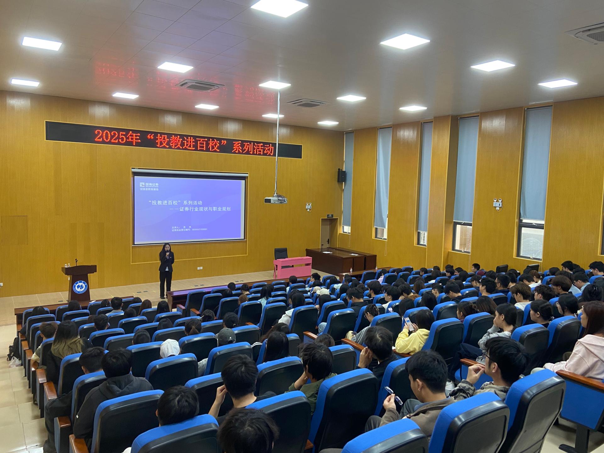 为深入贯彻学校“学生中心、产出导向、持续改进”的OBE(Outcome-Based Education)教育理念,全面落实“全员、全过程、全方位”三全育人工作要求,12月17日数字经济学院金融科技教研室特邀国海证券南宁鲁班路营业部苏杰总经理开展《证券行业现状与职业规划》专题讲座。金融科技、经济与金融等相关专业近300名学生参与本次活动,现场气氛热烈,互动踊跃。