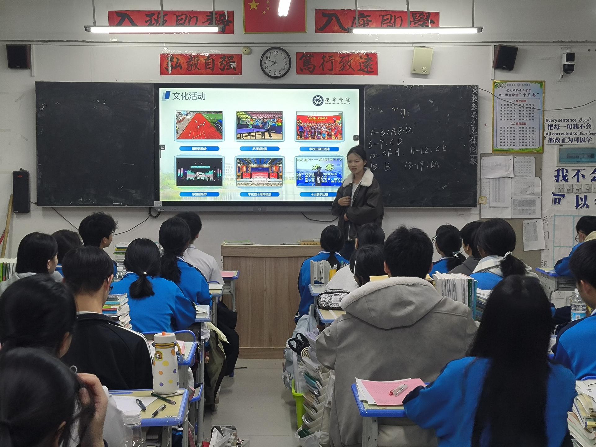 宣讲环节,周宁宁以“从邕江畔到数字浪潮之巅”为主题,通过动态视频与数据图表,向同学们展示了南宁学院的发展脉络:从1985年民革广西区委创办邕江大学,到2012年升格为应用型本科高校,再到2021年成为广西新增硕士学位授予立项建设单位,学校“应用型、开放式、新体验”的办学理念引发共鸣。针对钦州学子关注的区位优势,她特别强调了学校地处五象新区核心区、毗邻地铁4号线清平坡站的便利交通,并结合“15分钟生活圈”概念,介绍了周边万达茂商圈、钦州港自贸区等实习实践资源,让同学们直观感受到“学在南宁,业在北部湾”的区位红利。